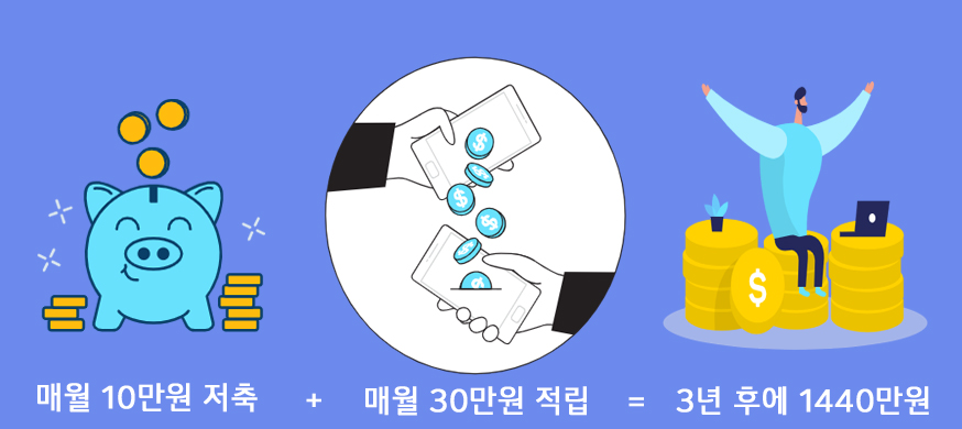 청년이 매달 10만 원씩 3년간 360만 원을 저축하면 정부에서 매 월 30만 원을 적립하여 3년 후 총 1440만 원이 저축됨.